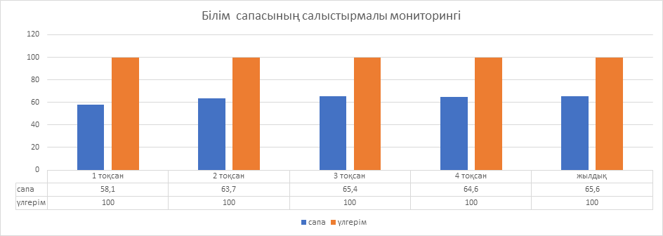 Жалпы орта білім берудің Мемлекеттік жалпыға міндетті стандартында белгіленген талаптарға оқушылардың білім білік дейгейлерінің сәйкестігін анықтау үшін тоқсан сайын әр пән мұғалімдері тарапынан және жалпы мектеп бойынша оқушылардың білім деңгейінің мониторингі жасалынып отырды. Мониторинг негізінде сыныптардың басым көпшілігінде оқушылардың білім, білік, дағды сапаларының көрсеткіштері стандарт талаптарына сай екендігі анықталды.
