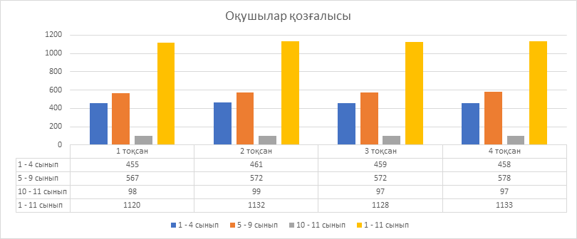 - 2023-2024 оқу жылының 1-тоқсанның басында мектеп бойынша 1120 оқушы болған. IV тоқсан аяғында 1133 оқушымен аяқтадық.