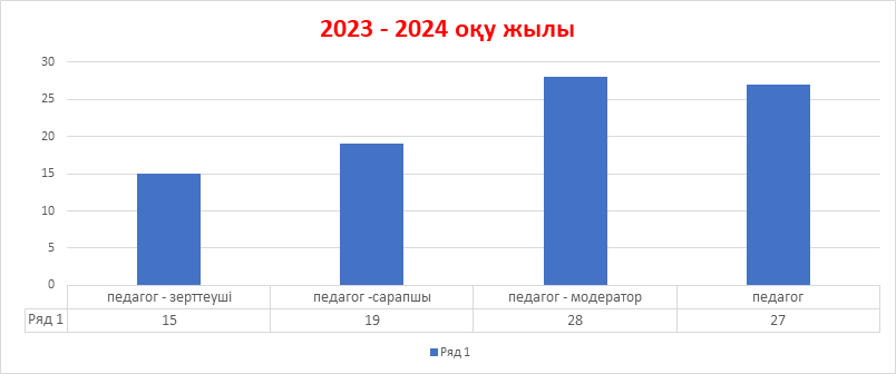 Оқу жылы | Жалпы педагог саны | Педагог-зерттеуші | Педагог-сарапшы | Педагог-модератор | Педагог \ санаты жоқ | ||||