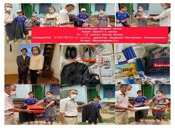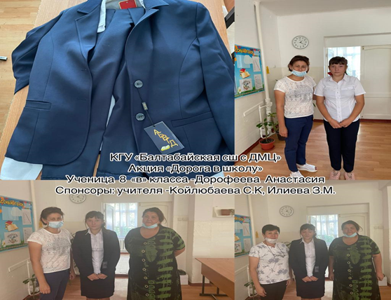 Жылдағы дәстүр бойынша 01.08.-30.09.2021 ж аралығында жалпы республикалық «Мектепке жол» қайырымдылық акциясы да өз деңгейінде өтті. Мектеп мұғалімдері 24 аз қамтылған білім алушыға 480.000 тг көлемінде мектеп формасы мен спорттық киімдерін тарту етіп, үлгі боларлықтай жақсылық жасады.