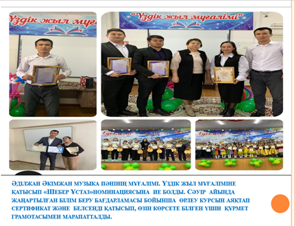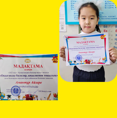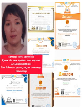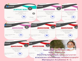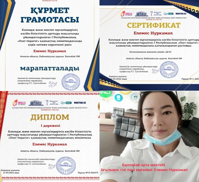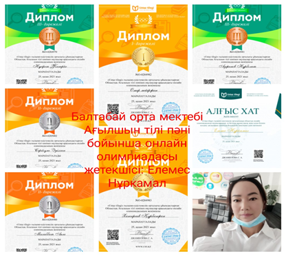 •«Ustaz tilegi» Облыстық қашықтық олимпиадасында оқушы Аджанов Нұрболат 3 дәрежелі диплом.•«Ustaz tilegi» Облыстық қашықтық олимпиадасында оқушы Нүсірет Жанерке 3 дәрежелі диплом.•«Ustaz tilegi» Республикалық қашықтық олимпиадасында оқушыларды белсенді қатыстырғаны үшін алғыс хат Елемес Нұркамал .