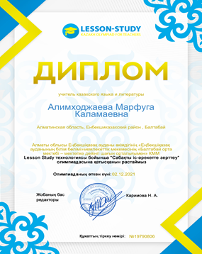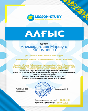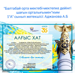 "Ustaz tilegi" ғылыми-әдістемелік орталығының ұйымдастыруымен бастауыш сынып пәнінен онлайн олимпиадасына шәкірт дайындап , оның білімдерін шыңдай білгені үшін Алғыс хат.