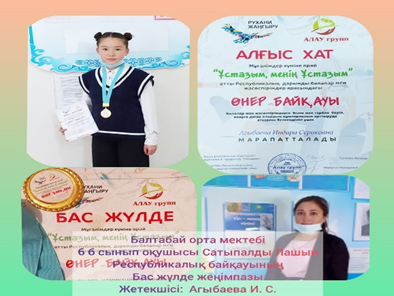 Нұрғали Ж,Бағдел П, Сандыбек А,Серік Р, Қарлыбаев А, қазақ тілі пәнінен Мырзалы А,Қарлыбаев А, Серік А. « www iBilim.kz» Республикалық онлайн олимпиада мен конкурс жеңімпазы Манап Маулен, «Үздік бастауыш сынып» қашықтық олимпиадасынан Мырзалы Аяжан жеңімпаз атанды.