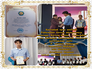 • Балтабай орта мектебінде “Жас келсе іске” атты жас мамандар сайысына түсіп Дуанбек Мадина 3 орын алды.