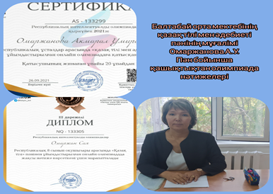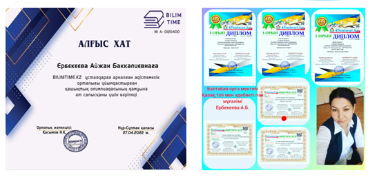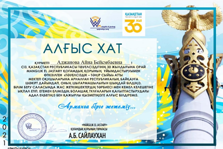 Ұлттық ғылыми зерттеу орталығының «Алғыс хатына» , республикалық ұстаздар арасында педагогика- психология пәндерінен ұйымдастырылған олимпиадаға қатысқанын растайтын «Сертификатқа» ие болды. (04.01. 2021ж ) «Ustaz tilegi»ғылыми орталығының «Алғыс хаты» (13.10.2021ж) Оқушылардыкі : Президент Қасым-Жомарт Кемелұлы Тоқаевтың «Тәуелсіздік бәрінен қымбат» атты бағдарламалық мақаласын оқушылар арасында кеңінен насихаттау мақсатында өткен «ҚР 100Үздік Дарынды Оқушы» республикалық байқауда білім алушылары Сандыбек Ақжол және Байдаулет Әлихан дәрежелік орынға ие болды. «Ubtest.kz» сайты математика пәнінен оқушылар арасында өткізген олимпиадасында белсенді қатысып, жоғарғы нәтиже көрсеткен оқушылар.