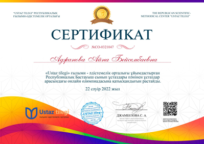 • Республикалық «Ustaz tilegi» сайтында оқу әдістемелік материал жариялағаны үшін сертификат