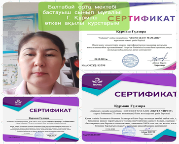 • Цифрлық құзіреттілікті арттыру курсынан өтті. • • • • Республикалық «Uchitelya» сайтында “Expessing op